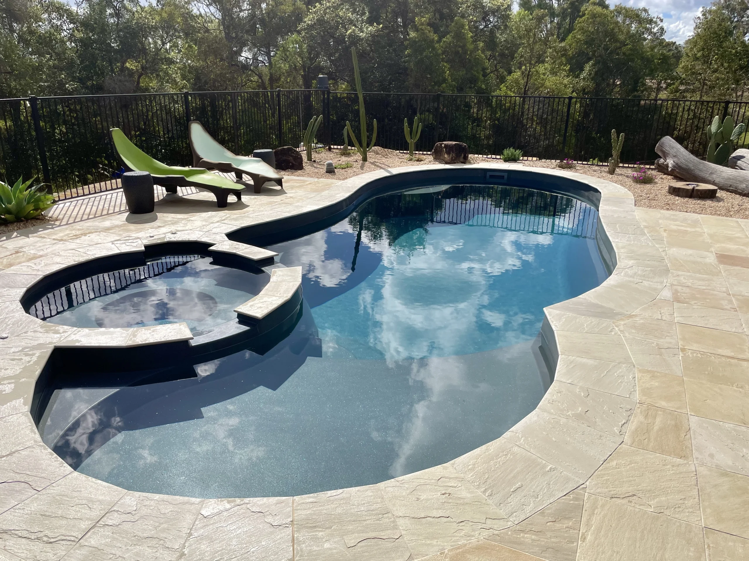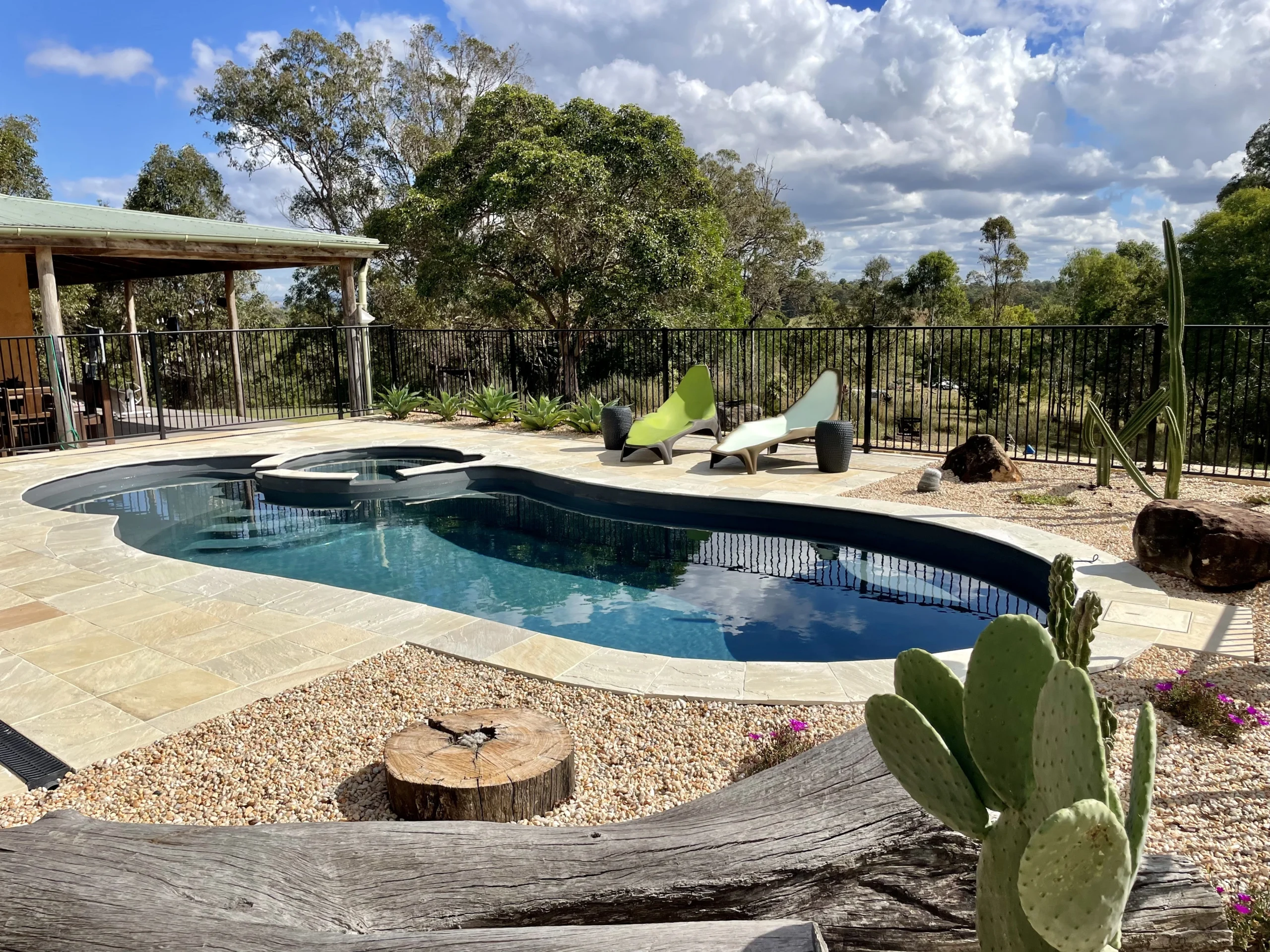 Set high on a sloping 20-acre allotment in East Deep Creek, Natalie and Glen’s pool project features The Allure 9.10m in Graphite Grey, chosen to perfectly complement their rammed earth home. Installed in September 2022, the project faced early challenges due to flood-damaged access roads following the Gympie floods, requiring the installation to be delayed.
