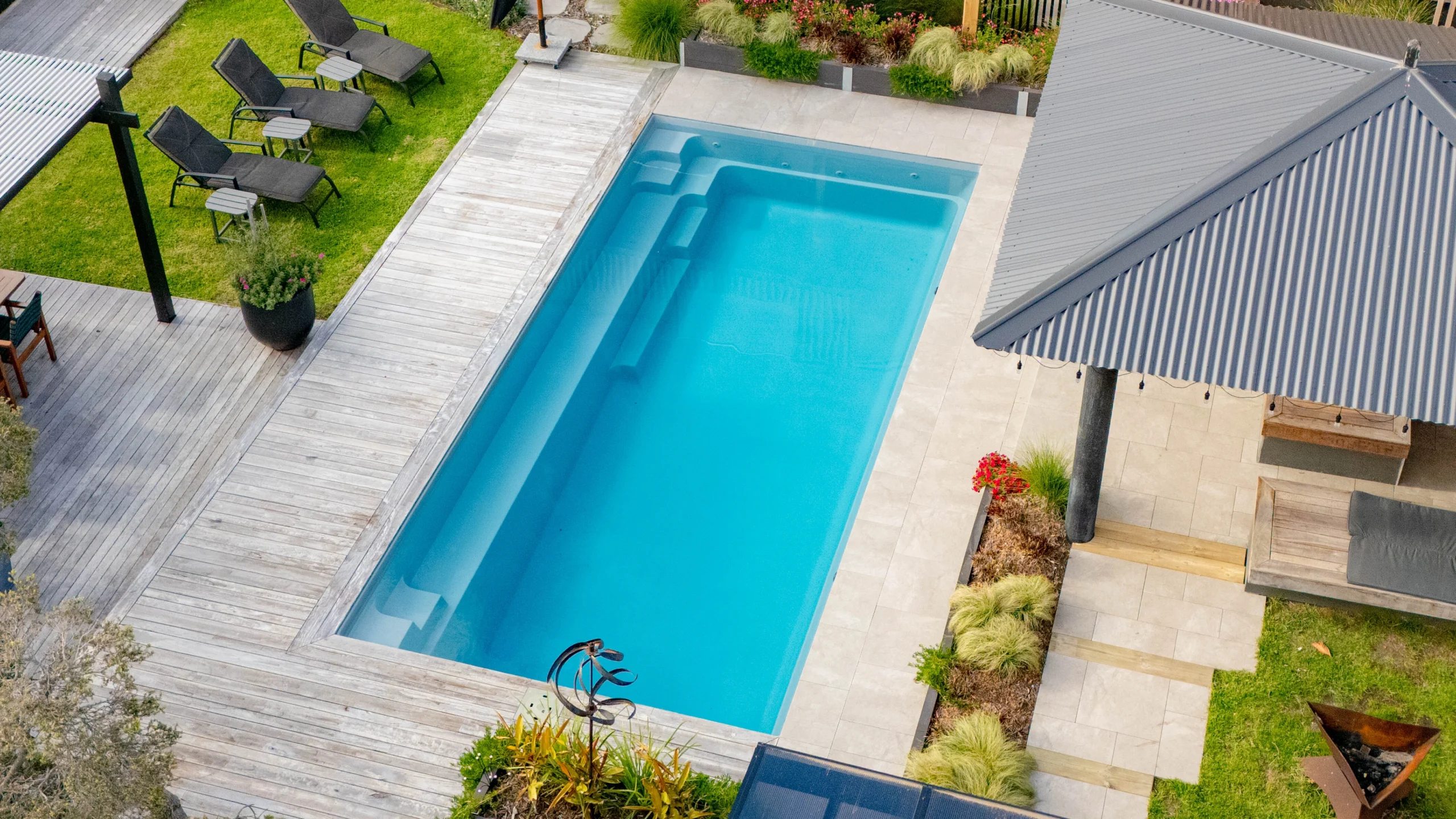 After researching online, the owners chose a Leisure Pools Fibreglass pool, The Reflection 8.00m in Silver Grey, for its professional service, fast and seamless installation, flexible design options, and ability to create a resort-style outdoor living space that supports family connection, relaxation, and year-round enjoyment across generations.